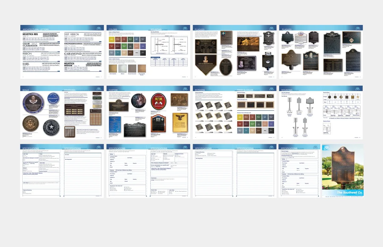 A product catalogue designed to showcase custom made plaques and signage offered by the Southwell Co, a San Antonio based signage company. This catalogue includes information about the company, examples of custom made plaques (many of which were of my design), an informative guide on how custom orders are made, and an extensive order form.