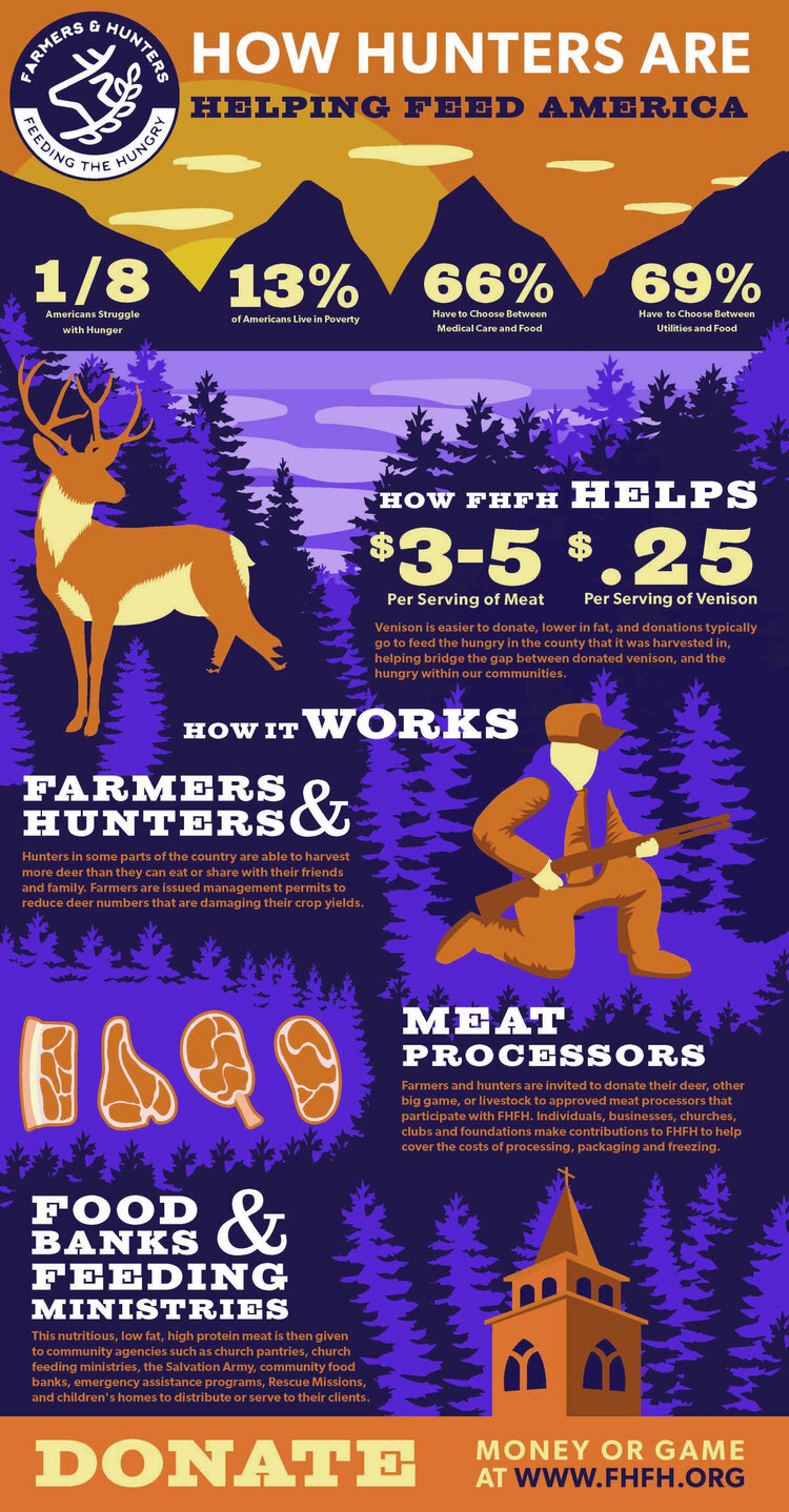 Multi-Media Campaign for Farmers and Hunters Feeding the Hungry (FHFH), a Christian non-profit which seeks to provide hunters with a means to donate their game to meat processors for distribution to America’s hungry. The Campaign assets are positioned to persuade and encourage people to donate either money or game to the cause. Produced touchpoints include a billboard, full page ads, and an infographic.